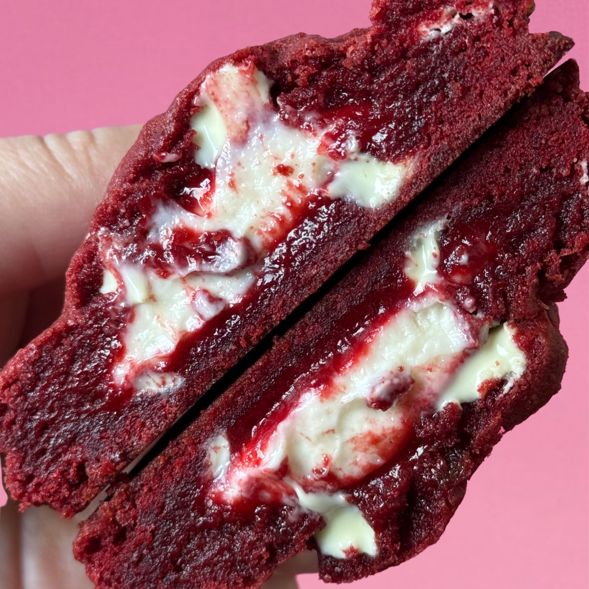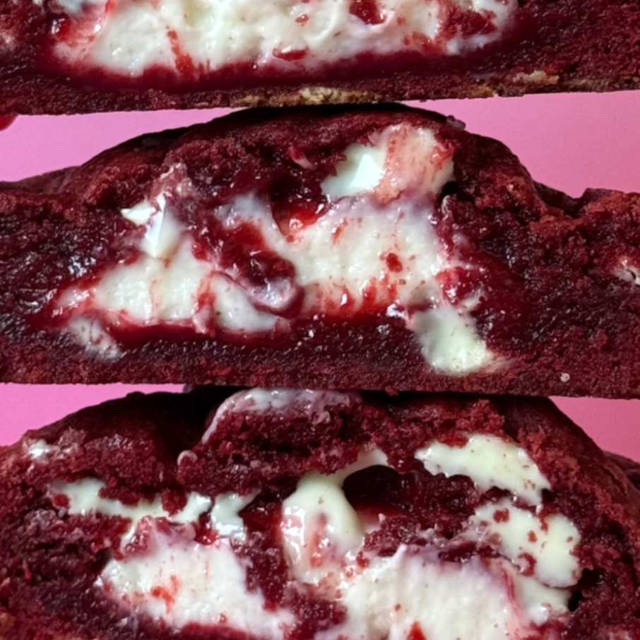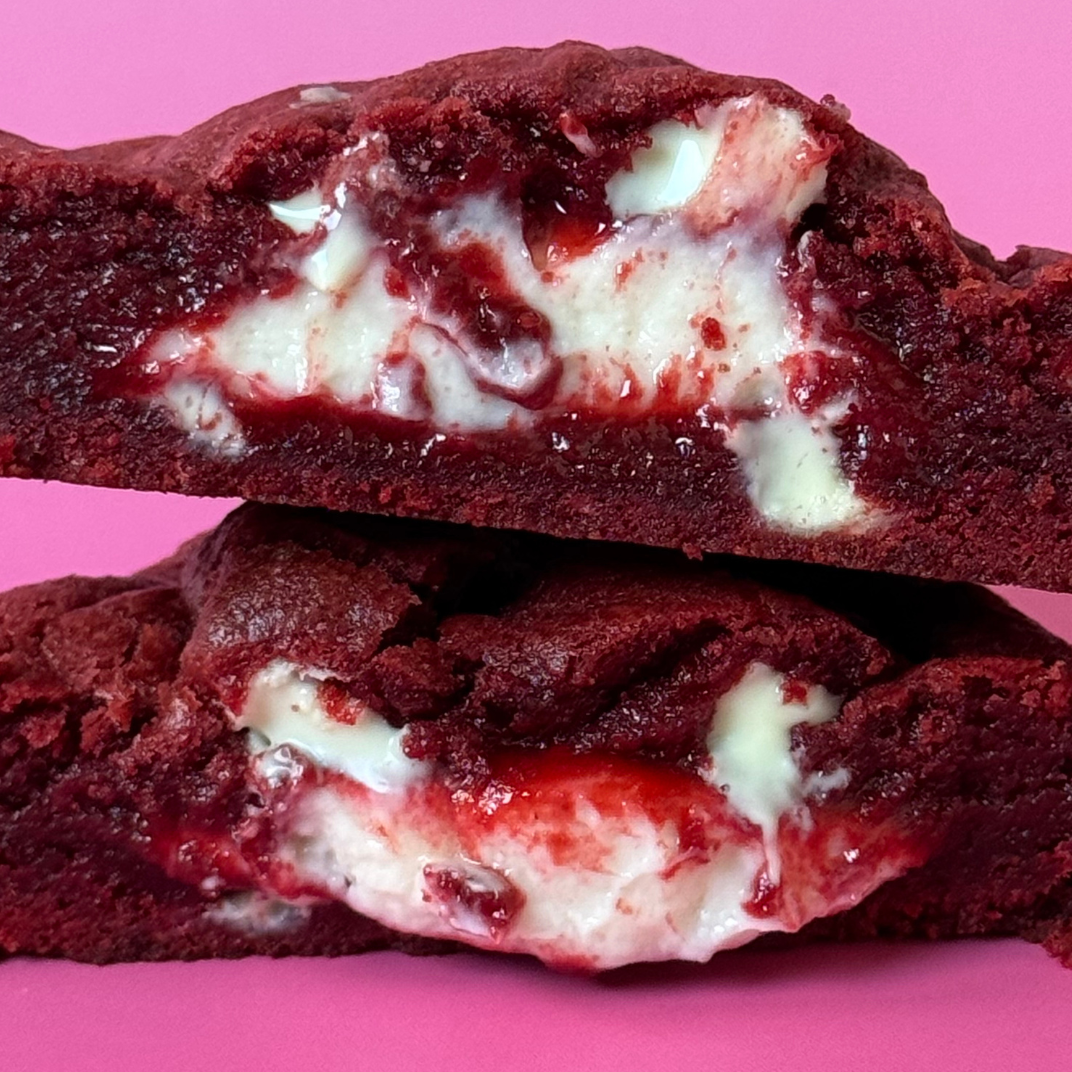 Aussen samtiger Red-Velvet-Cookie, weich und intensiv.